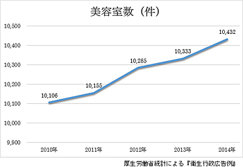 厚生労働省による調査データに基づき、北海道内の美容室数の2010年から2014年までの5年間の推移を表したグラフです。5年間に326件と緩やかに件数を増やしています。2010年から2011年、2012年から2013年はそれぞれ50件程度の増加に留まっているのに対して、2011年から2012年は130件、2013年から2014年は99件と、倍以上の伸びを示しています。