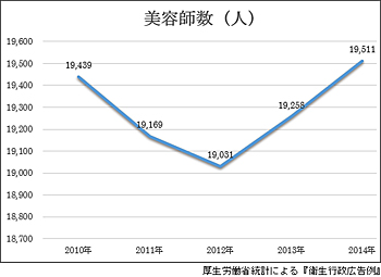 グラフは、2010年から2014年の5年間の北海道内の美容師数の推移を表したものです。注目すべきは、2010年から2012年にかけての400人以上の減少。その後、美容師数の推移はプラスに転じ、2014年には、2010年の19,439人を上回る19,511人まで回復したという点です。 北海道内の美容師数の大幅な減少には、減少がはじまった2010年に国内世帯平均所得が平成以降で最低を記録したことが影響していると考えられます。美容師数の大幅な減少に対し、2010年から2011年の美容室数も50件未満の増加に留まり、ほぼ横ばい状態。平均所得額の大幅な減少が美容室の利用頻度に影響し、それが給料減額による転職やリストラなどによる美容師数の急激な落ち込みの要因となったことが推測できます。