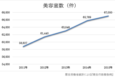 東京都内の美容室合計数の5年間の推移を表したものです。東京都内では2011年から2015年にかけて5年間で約8000件の美容室が増加しました。1年間で約1600件以上、1日4件以上がオープンしていることになり、順調に右肩上がりとなっている事がわかります。美容室の件数は日本全国の中で東京都が断トツ1位を誇っており、2位の大阪府に約5500件引き離しています。全国の美容院の数は23万7525件ですので、約10分の1の美容院は東京都に集中していることになります。