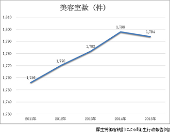 福井県の美容室数の5年間の推移を表したグラフです。2011年から2014年までの3年間は右肩上がりの順調な伸びをみせていますが、2015年は4件減少しています。