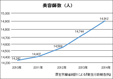 グラフは、静岡県内の美容室合計数の2010年から2014年の 厚生省による調査データに基づいて5年間の推移を表しています。2013年から2014年の1年間の推移のみ、ほぼ変化がないものの、静岡県では5年間に435件も増えていることがわかります。特に、前年に比べ17件減った2011年から2013年には、2年間に382件と好調な伸びを示しています。