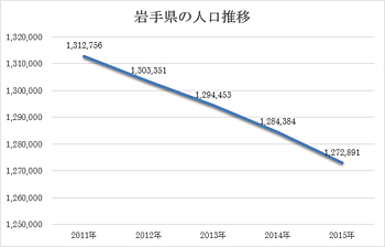 グラフは、2011年から5年間の人口推移を表しています。岩手県内では美容室数・美容師数ともに年々減少していますが、この傾向は特に東日本大震災のあった2011年から著しくなっています。その要因として、震災以降の県外への移住などによる人口の激減が影響していると考えられます。