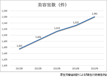 鳥取県の美容室数の5年間の推移を表したグラフです。鳥取県内では毎年、緩やかに件数を伸ばし、5年間に106件の美容室が増加しています。