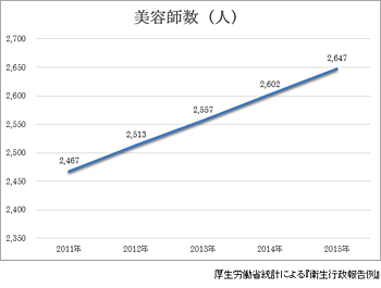 グラフは、鳥取県の美容師数の5年間の推移を表しています。美容室数の推移グラフと重なるように美容師数も増えており、5年間に美容室数の約1.8倍にあたる180人増えています。