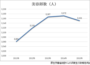 グラフは、高知県の美容師数の5年間の推移を表しています。美容室数の推移グラフと重なるように美容師数も増えており、さらに2015年は美容室数の推移と同じように増加から減少に転じています。こちらも前出の美容室数のグラフ同様、美容業全体の「客数の減少」と「客単価の低下」の影響によるものであることが推測できます。