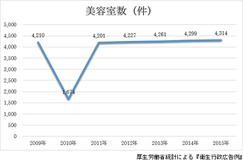 グラフは、2009年度から2015年度までの5年間の宮城県の美容室数の推移を表したものです。調査を実施した厚生労働省によると、美容室は閉鎖の届け出をしない限り、営業中の店舗として「件数データ」に残り続けるとのことなので、宮城県の美容室件数データには震災の影響などで閉鎖の届け出を出していない店舗が含まれている可能性があります。