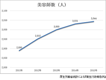 佐賀県の美容師数の5年間の推移を表したグラフです。美容室数の推移グラフと同調するように2桁台のゆるやかに増加しており、今後も美容室数とともに順調に人数を増えていくことが期待できそうです。