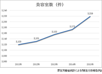 厚生労働省統計『衛生行政報告例』に基づいた長崎県の美容室数の5年間の推移を表したグラフです。5年間の増加総数は99件と2桁台のおとなしい増加数ながらも減少することなく件数を増やしています。