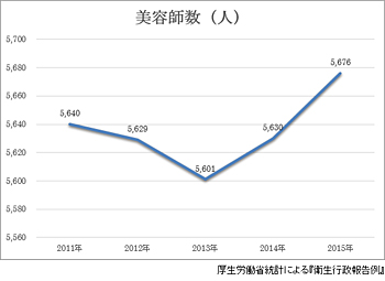 グラフは、長崎県の美容師数の5年間の推移を表しています。減少することなく増加している美容室と異なり、美容師数は2011年から2013年まで減少を続け、2013年から増加に転じるV字型の推移をみせています。