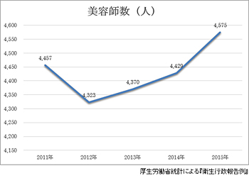 グラフは大分県の美容師数の5年間の推移を表しています。美容室の5年間の推移グラフと比較すると、2011年から2012年は美容室の減少に伴い美容師数も134人減っていますが、美容室の減少と同じく、九州北部を中心に発生した集中豪雨「平成24年7月九州北部豪雨」の被害によるものと推測されます。大分県の美容師数は、翌2013年から2015年にかけて美容室と同様に増加しています。