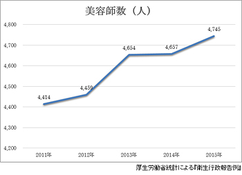 沖縄県の美容師数の5年間の推移を表したグラフです。美容室数の推移グラフと比較すると、2013年は美容室数が減少しているのに対して美容師は195人も増えており、この年のみ美容室数と美容師数は正反対の推移をみせています。