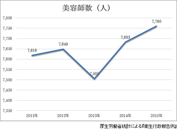 グラフは、福島県の美容師数の5年間の推移を表しています。福島県の美容師数の推移をみると、まず目につくのは2011年から2012年にかけて30人増加していますが、2013年は144人も減少していることです。しかし、その後の2年間は順調に数を増やし、計255人増えています。