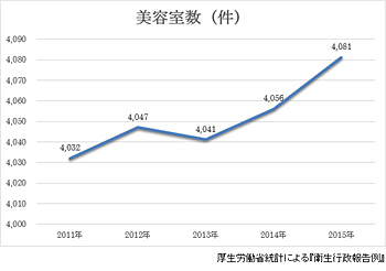 栃木県の美容室数の5年間の推移を表したグラフです。2008年の厚生労働省『衛生行政報告例』によると都道府県別の美容院数ランキングは20位。全国平均の4,711件を下回り、毎年の増加数も2桁台です。2011年から2012年は15件増えていますが、2012年から2013年は6件減少。3年間の実質的な増加は9人に留まっています。その後は順調に増え、2013年から2015年の3年間に40件の美容院が増加しています。