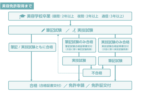 国家資格を得るためにはまず、厚生労働省が指定する養成施設(美容学校)の課程を修了する必要があります。入学資格は資格は原則【高卒以上】、入学試験に通過しなければなりません。(※中卒受入れ可の学校もあり)美容学校には通学する「通学課程」と、通信教育で受講する「通信課程」があり、通学過程(昼間部、夜間部)2年/通信課程3年のいずれかを修了することで、国家試験の受験資格を得ることができます。